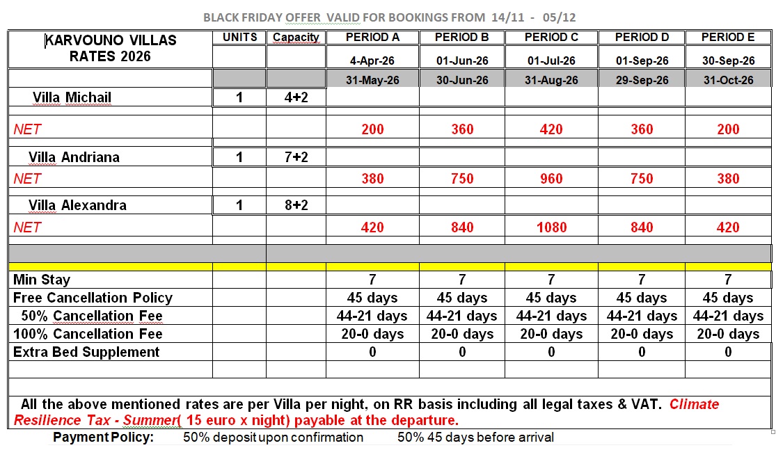 CONTACT US BY EMAIL TO TAKE THIS OFFER at info@karvounovillas.gr